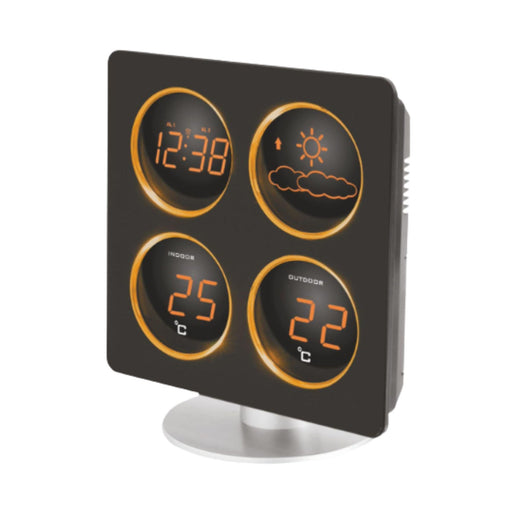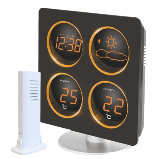 Horloge radio pilotée DCF-77 Affichage de l'heure 12/24h. Date et jour de la semaine Indicateur du niveau de soleil et de lune pour les villes sélectionnées Intérieur et extérieur...